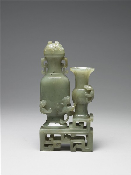玉質,有黑點及白斑。器鏤雕成小几,上盛一瓶與一觚,二器上共有三小螭攀伏;瓶雙耳,有浮雕獸紋鈕蓋。器底陰刻「乾隆年製」篆款。