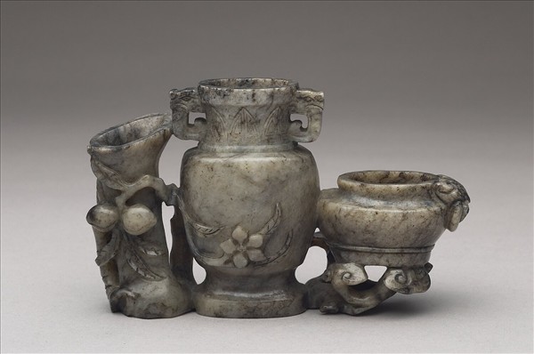 玉質,灰白色有黑斑紋。全器為一雙耳瓶、一盂與一樹幹形管,周身以桃枝、葉、實相連,盂底雕有靈芝為架托。瓶底有「乾隆年製」陰刻篆款。