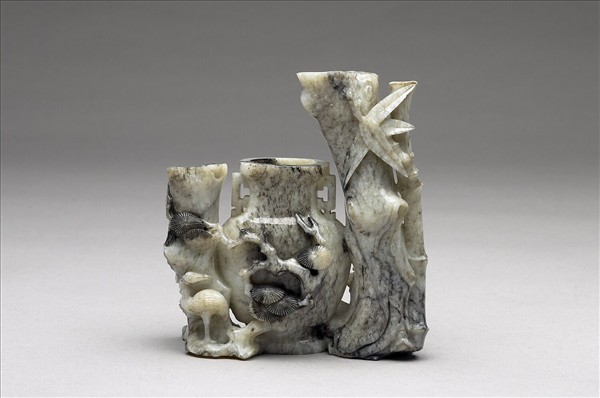 玉質,有黑斑,器身琢有梅根、松樹根,及瓶各一梅與松根亦挖成空為容器,周圍琢飾有鹿、靈芝、竹葉、梅花、鶴及松樹等紋飾,瓶底刻有「乾隆年製」篆款四字。