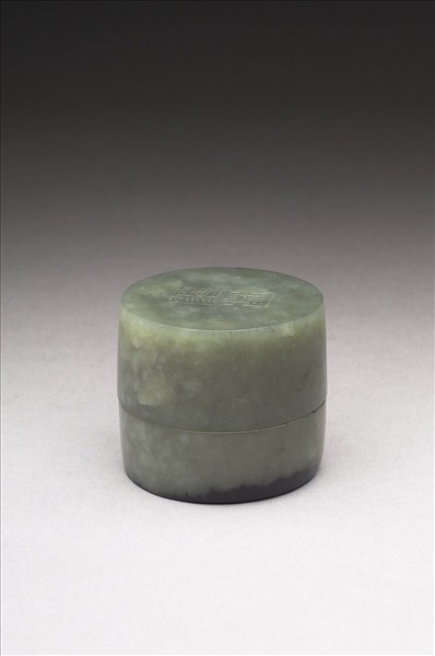 玉質,有白斑,蓋面呈純黑色。圓盒,子母口,直壁,平底,全器光素無紋。器底琢有單框線「墨林」篆款。