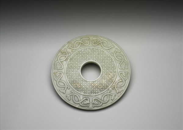 孔壁刻有「乾隆年製」款。雙面均有紋飾,作環狀的分布:內環為乳丁紋,外環則為八組交纏、簡化的龍紋。相鄰的兩組交龍紋,採左右對稱的形式。
