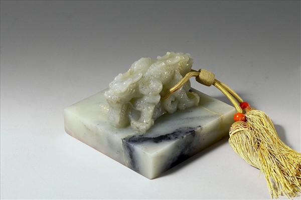 玉印,交龍鈕,印面正方,印文篆字「信天主人」,乾隆皇帝所敕定代代相傳的二十五寶中,有多方印記皆作交龍鈕,可見這方印記有一定的重要性。乾隆二十三年(1758),清高宗因向天祈雨有應,故自號為「信天主人」,此為高宗是號之始。後平準部回部後,於乾隆二十四年作〈開惑論〉一文以記此事(《御製文集初集》卷3),文中乾隆皇帝化身為「信天主人」,調和群議、彰顯一己之睿斷。此文撰成後隨即刻「信天主人」印以記此事,這是乾隆皇帝使用「信天主人」印記的開始。爾後,他還刻有多方大小、印式相異的「信天主人」印記,玉器、書畫上皆見其鈐跡。特別是根據《石渠寶笈續編》的記載,「信天主人」印記與「乾隆宸翰」、「淳化軒」幾乎都集中鈐用於收藏在「淳化軒」的書畫上,且《寶藪》中亦見三印同儲一盒的記錄。而本印雖未見於《寶藪》載錄,但其印式與書畫上三印同鈐的「信天主人」相當類似,只是尺寸較大,所以本印可能也有著類似的使用脈絡。值得注意的是,規劃於六十年退位的高宗,越近退位之日越期待其年壽,於是一再強調對於天恩的「信賴」,因而對「信天主人」一詞的態度也有了轉變,且「淳化軒」亦被乾隆皇帝選為退位後休憩賞遊的地點之一。所以,「信天主人」和「淳化軒」印記並用的狀況,可能也顯示了乾隆皇帝這一心態上的轉變。