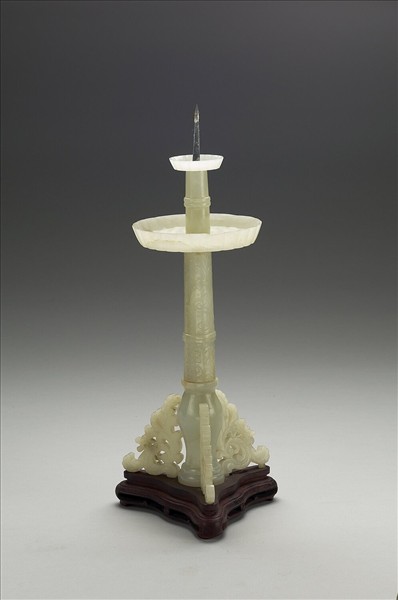 本器同〈金甌永固杯〉(故雜5490)為元旦開筆儀式御用,以玉雕花瓣形狀的大小承盤,大承盤的盤心陰刻八字篆體「乾隆年製」、「玉燭長調」,玉挺分上下兩部分,上段刻弦紋,下段以淺浮雕連枝花葉紋,下方玉穩瓶固定於紫檀座,並裝飾三個鏤刻花草玉插角。〈玉燭長調燭臺〉及〈金甌永固杯〉的製作是在乾隆四年(1739),由乾隆皇帝授意下設計開筆儀式所用,充滿吉祥寓意,且將身為一國之君最衷心期盼的「金甌永固」與「玉燭長調」,藉由〈金甌〉與〈玉燭〉的發想與製作做最具體的呈現。