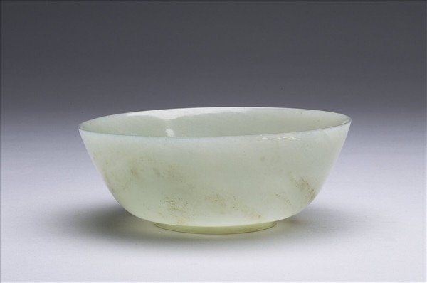 玉質,有灰赭斑。口稍外撇,弧形壁,平底,有圈足。壁薄可透光。圈足內陰刻有「乾隆年製」隸款。以錦袱包裹,收納於裱錦木盒內。錦袱作藍色菱形連續圖案;木匣外錦緞則為六角形錦地團龍紋。