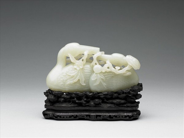 玉質,玉色泛白。全器為雙鶴立雕,大小兩鶴皆回首,作兩兩相對蹲伏姿態。兩鶴口啣靈芝、桃實與梅花枝葉。附木座,以錦袱包裹,收納於裱錦木盒內。