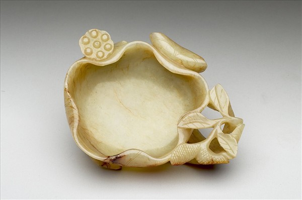玉質,有大片淺赭斑。全器作荷葉形,洗略成圓形,口做荷葉滾邊。洗底並無刻紋,洗底至外壁浮雕有莖葉與蓮蓬,並為耳及底。
