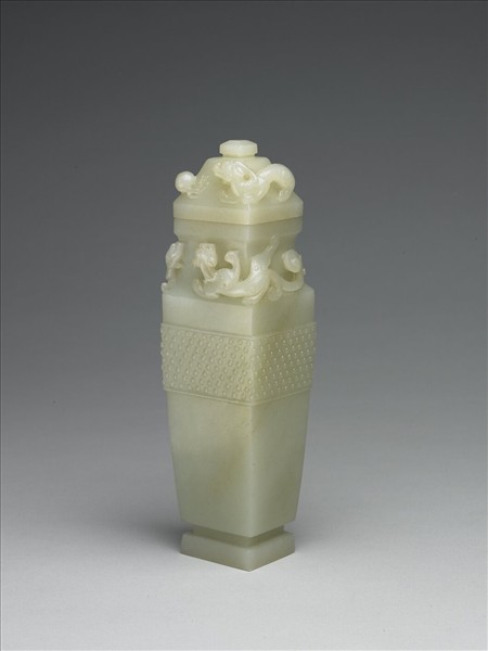 玉質,玉色略黃,有淺赭斑。全器呈方形,帶鈕蓋,短頸,斜肩,直腹,有圈足。蓋面高浮雕螭龍戲珠、頸部則高浮雕兩隻小螭,腹部飾乳丁紋。附有錦袱。錦袱作紅底多彩提花圖樣,提花作纏枝花卉、瓜藤與蝴蝶,瓜、藤蔓及蝶,有瓜瓞綿綿富貴不絕的吉祥意喻。