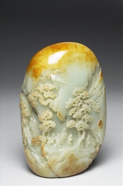 玉質。頂端未加雕琢,保留玉子飽滿原貌。琢五老遊山。兩老正順坡而下,兩老則於平臺論景,一老獨立古松之下,優遊遠眺。以減地之法造景,營山林巖洞幽深的效果。五老,指宋代杜祈、王渙、畢世長、朱貫、馮平。五人年皆八十餘,仍康寧爽健,共組五老會賦詩酬唱。