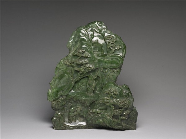 玉質。正面浮雕山石、松樹、靈芝、屋宇,中央雕一老者,持杖,下方有一童子,雙手捧一花盆。背面亦琢山水,上方雕一飛鶴,右下方有一隻立鶴,左邊琢兩鹿,一為立姿,一為臥姿。