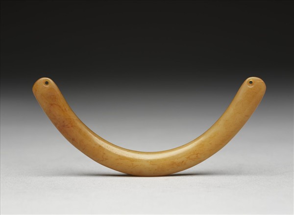 此件玉髓璜屬清宮舊藏,表面即可還看出有黃褐色的染料,估計是在明末至盛清時,為了提高市場價值而被染色的。由於它曾被染色而降低了透明度,驟視之,很像閃玉(nephrite),經測量比重為2.64,才確知是玉髓(chalcedony)。 這種條形璜曾流行於史前江南地區,此件弧度優美,兩端磨薄,小孔系對鑽而成。