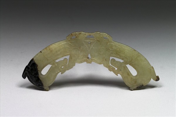 玉質,有赭斑,一端有黑斑一片。器作璜形,鏤雕兩龍兩鳳,面各相向。兩鳳中間鑽有一小孔,以繫繩佩戴用。