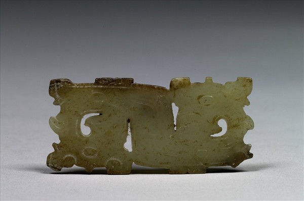 玉質,有赭斑。長方形,鏤雕S形龍,兩端各琢一龍首,龍首皆有「介」字型結構。富古樸之趣。