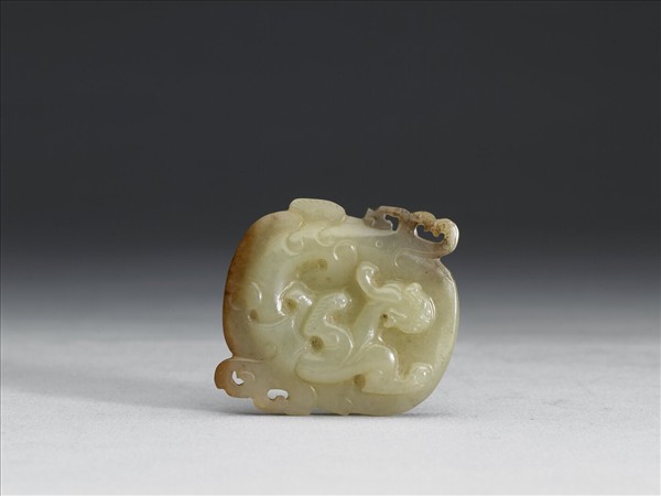 玉質,有灰斑,並帶一片赭斑。橢圓形,為嵌於他物上之飾件。一面鏤空浮雕獸紋,一面光素無紋。小巧精美。