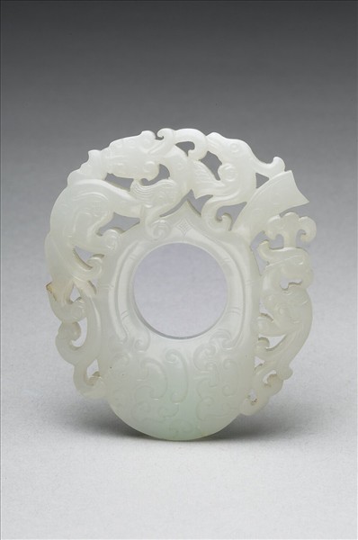 玉質,僅龍後足微微受沁。明清玉器常仿製早期作品,本器即完全模仿西漢時期的韘形佩,然形紋雖肖似,卻仍透露出若干明清的風格特徵。具功能性之玉韘在晚商即已出現,目的是為了戴在指上用以勾弦張弓。至東周時,形制演變成器身有一套指的中孔,旁側延伸出勾弦的長勾。時至西漢,玉韘已無實用功能,並扁平化,變形為裝飾用的韘形佩,一如本件仿作。觀察本器,中央圓孔即為原手指套戴之處,中間向上收尖呈果核形的部分是韘形佩的主體,在主體右上向上弧形延伸的長條造形來自早期玉韘中用以勾弦的部位,剩餘部分則設計了神獸和鳯鳥。
