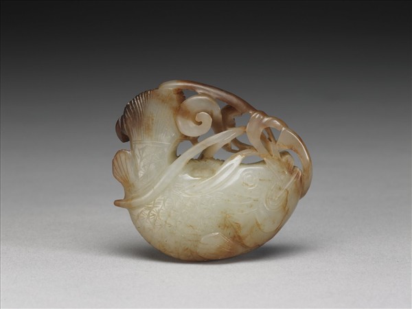 玉質,邊緣有大片褐斑,琢一優游水藻間的鱖魚。魚身豐腴,腹部尤其飽滿,然因尾部上揚,線條又極為自然流暢,賦予了強烈的躍動感。陪襯的水藻採多層次鏤空技法,更增作品生動活絡的趣味。