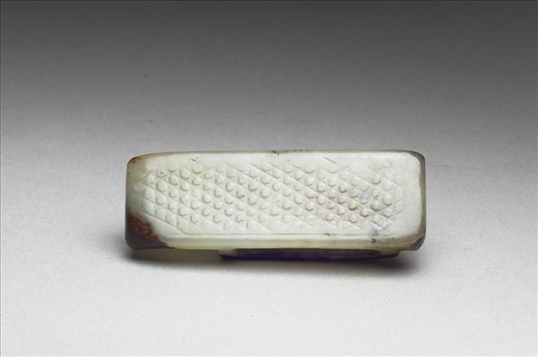 玉質,有赭斑。器面刻三種不同方向之平行線紋,其交叉處琢乳丁紋為飾。