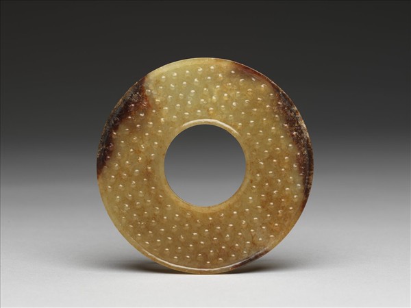 玉質,略呈褐色,外緣局部有暗褐色沁,其他部分布褐絲紋,半透明。圓整,有廓,不甚整齊,外緣微傷;中孔、外緣齊整;器面上刻飾穀紋。