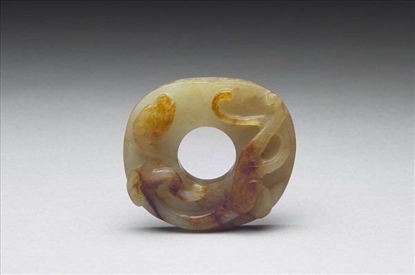 玉質,有赭斑。器略作橢圓形璧,器面高浮雕一螭,巧妙運用玉質顏色在首及身尾有赭黃色斑,另一面及環身皆陰線刻雲紋,刻線斧鑿痕跡明顯,不甚精細。仿南宋至元風格。