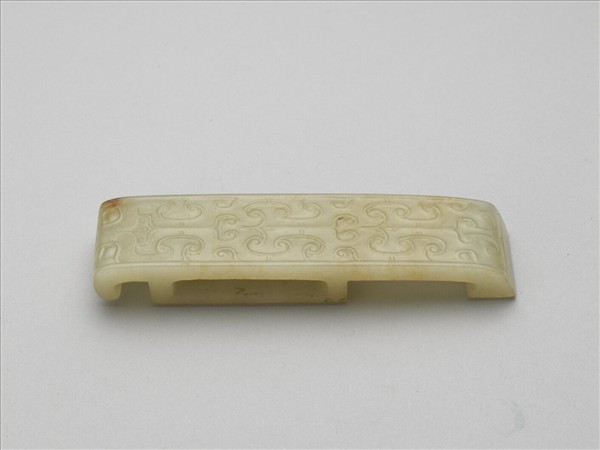 玉質,受沁白化現象輕微,加上拋光完好,可一窺漢代玉劍璏剛完工時如同玻璃閃亮的光芒。由劍璏和劍身的比例,可知其原本搭配的劍身較長。至於紋飾設計,下方可見具有獸眼及雙眉的獸面(劍璏實際使用時獸面應朝上),由下至上則以重複的紋飾單元鋪列器身,勾勒出簡化的獸身背脊,這是西漢中期至東漢常見的紋飾設計模式。