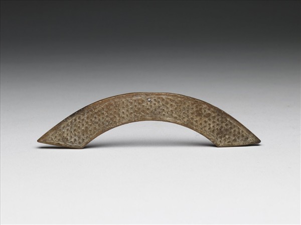 深赭色玉,略有黑斑。器狹而較平,器面周圍有弦紋為廓,內琢密集乳丁紋,雙面同紋,其中一面因磨損而較不清楚,正中有一穿可供掛佩。