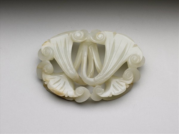 玉質皙白光潤,微帶金黃色玉皮。琢碾成四朵折枝凌霄花。花朵同出一枝,一對低垂;一對昂揚,營造出壓疊交結的趣味。兩側的花瓣翻卷成雲頭狀,似為強調花朵正值盛開之際。背面光素,刀斧之痕歷歷。 右幅玉匠選一塊灰玉鏤雕兩株折枝凌霄花,每株有三小枝,一枝為葉二片,一枝為花一朵,另一枝叉出一花一葉,枝葉纏繞;每株的兩朵花,一朝上,一朝下,枝梗與朝下的花朵末端琢磨稍平,使全器可平置於檯桌面,枝梗末端與朝下花朵邊緣似有意稍加磨製,使全器又可豎立於檯桌面。雙陰線刻葉脈與花瓣脈紋。 1972年在北京小西天師範大學一康熙年間的墓葬中,曾出土形制相似的凌霄花,用無瑕白玉雕成,尺寸較大,長12.8公分,寬7.4公分,與本院藏品當屬同一時代,唯前者背面有互相穿連的六對小孔,有研究者從碾工、造型、紋飾判斷此玉飾為墓主收藏的骨董,實為元代作品。