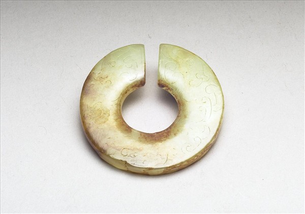黃綠色半透明閃玉,尚稱溫潤,局部赭沁斑。圓片形,厚薄尚勻,缺口相對之另一邊的邊緣有缺傷。勻面接近中孔的部位琢得較薄。器表於明代加琢細陰線龍紋,紋甚模糊。