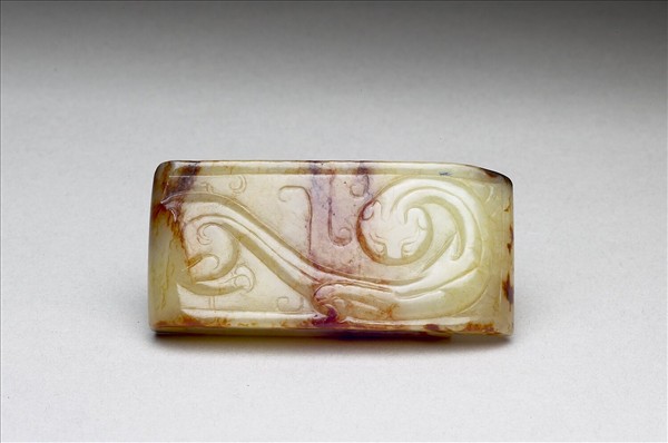 玉質,全器受沁呈淡黃褐色,局部呈深褐色,左端及底部似曾略加修整。正面神獸的獸足屈曲,腿部肌肉飽滿,足爪犀利分明,皆是西漢時期的風格特徵。