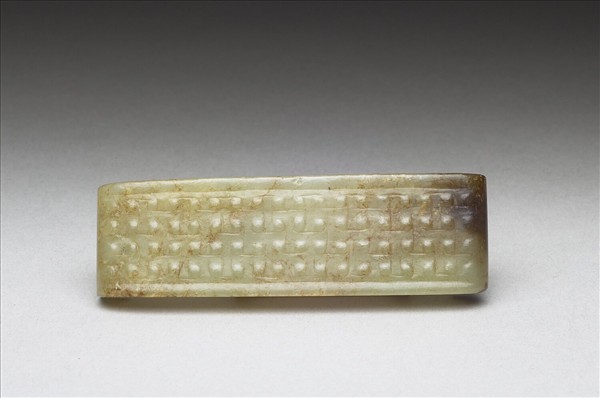玉質,有黑斑。長條形,器面二長邊側各琢一道弦紋,內琢乳丁紋而以細凹線連接,形成雲紋。