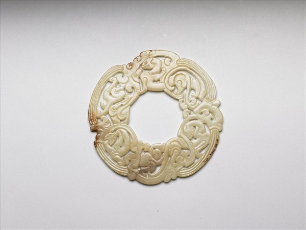 玉質,間有赭斑。圓璧狀,極扁平,器面鏤雕三螭,螭足踏雲紋,頭尾相連接成環形,還有一隻小獸蹲伏其間。