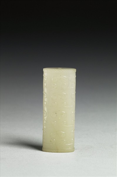 玉質。圓𤨕,屬裝飾品類。扁圓柱形,上下有一通心穿孔。兩端琢繩紋,周身琢雲紋。雕琢工整。
