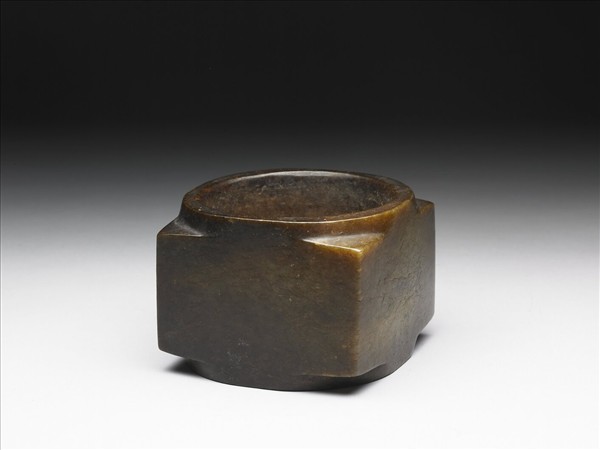 玉質,深褐色。琮,內圓外方,中有孔上下貫穿,壁較淺。全器光素無紋。