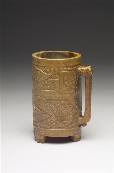 玉質,帶糖與皮,屬中國西北玉料。直圓筒形,器體厚實,器壁厚薄一致,器身與底非一體成形,底為加嵌的,三獸首足,器側單把,把端飾獸首。環器平浮雕雷紋、龍鳳紋,器底飾渦紋、絲股紋,琢工精細,近似乾隆雕工。器面呈色除原玉料的顏色外,局部加深褐白色而呈鱔魚黃色。附木座。此器的呈色與雍正、乾隆時期喜作的廠官鱔魚黃釉色瓷相近。