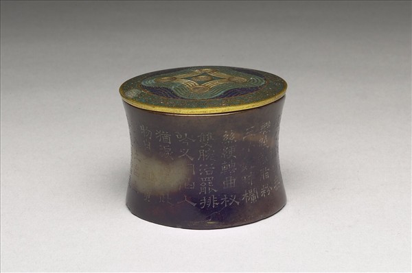 玉筒形花插,外壁中段內凹,青黃玉石,大部分受沁成褐色,色澤溫潤。外壁鐫刻隸書:「宮殿千門稱漢家,金釭玉井製極奢。轆轤之錧白無瑕,曉粧脂粉三千娃。球欄絲綆轉曲杈,雙腕浴罷排吟叉。銅仙人猶淚似麻,此物自合埋黃沙。入土出土事堪嗟,當年何用珍斯耶。土浸晻濭如絳霞,配以銅膽簪雜花。與沃精神汲井華,弗失其故興懷遐。乾隆丙申春(四十一年,1776)御題」及陽文「比德」、陰文「朗潤」二印文。由「配以銅膽簪雜花」一句交代本器加了內膽,也因此改變了用途,成為小型花瓶。銅膽呈柱型,膽蓋掐絲填藍、綠、白三色琺瑯料。中置一孔,餘四孔周繞,孔洞的大小一致,整體厚重,造型細緻,貌似蓮蓬。為清雍正皇帝所稱「蓮蓬式」內膽,是乾隆四十一年的定年器。本展品為古器配新裝,是以古為用插花擇瓶概念之呈現。
