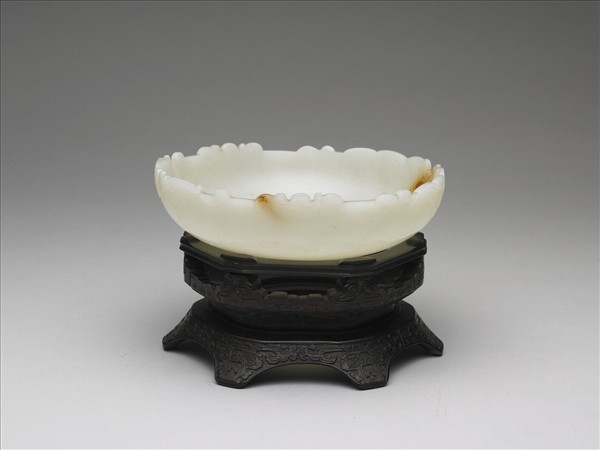 玉質,有赭色斑。洗壁淺。器外壁近口沿處琢鳳紋。底有「宣龢」二字款。附木座。