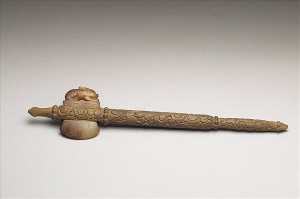 玉質,全器多帶赭色斑。斧鑲嵌於木柲。頂雕一隻獨角異獸;斧身琢回紋。