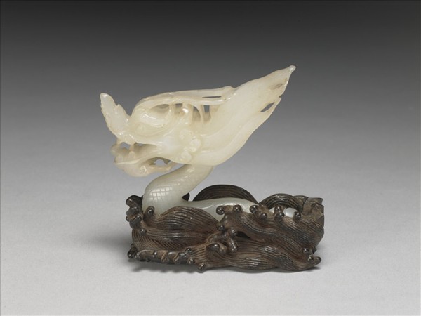 白玉,玉質溫潤。圓雕龍首,外型逼真,紋飾線條細膩;棒狀身軀為之字形,表面陰線刻菱格紋以表現龍鱗。附長方形波濤紋木座一只。