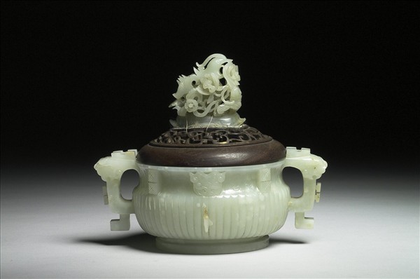 玉質。腹琢直棱紋,雙獸耳。元代玉頂,雕鴛鴦蓮花。木蓋,鏤雕卷枝花紋。