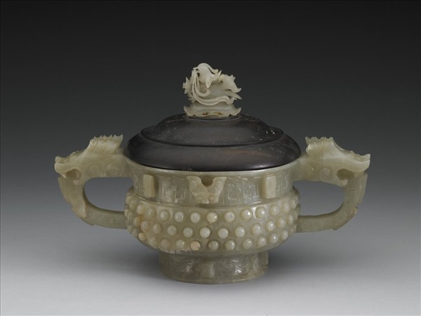 玉質。仿銅簋形爐,雙獸形耳,耳圈誇大,高圈足。口沿下方和圈足飾棱脊、夔紋獸首,腹部則佈滿乳丁紋。木蓋嵌元代玉頂,雕鴛鴦蓮花,精巧可愛。
