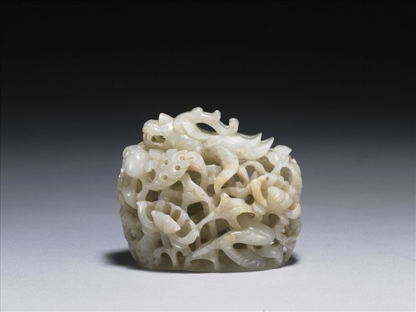玉質,刻的是飛龍戲珠和蓮花,多層次的鏤空雕刻,製造出繁複的視覺效果。推測鑲嵌於另一主件上作裝飾用。