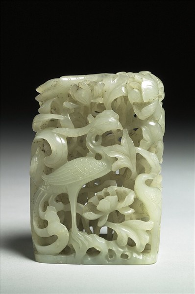 玉質,雕出成雙成對的各式鳥,多層次的鏤空雕刻,製造出繁複的視覺效果。推測鑲嵌於另一主件上作裝飾用。