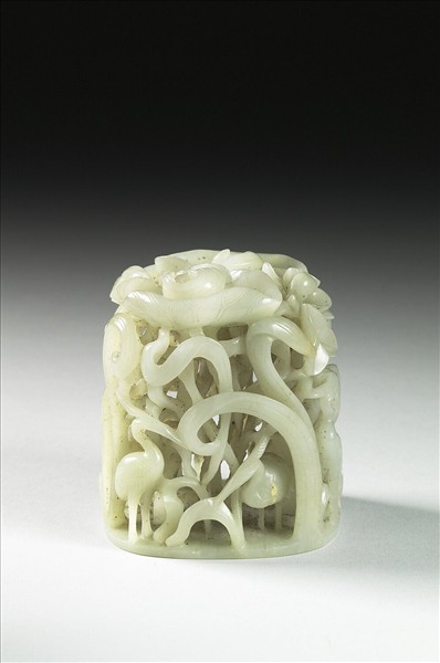 以玉雕刻出白鷺鷥群聚於蓮花池畔的姿態,多層次的鏤空雕刻,製造出水草叢生的的視覺效果。底部有四個小洞,推測用來固定於另一主件上。
