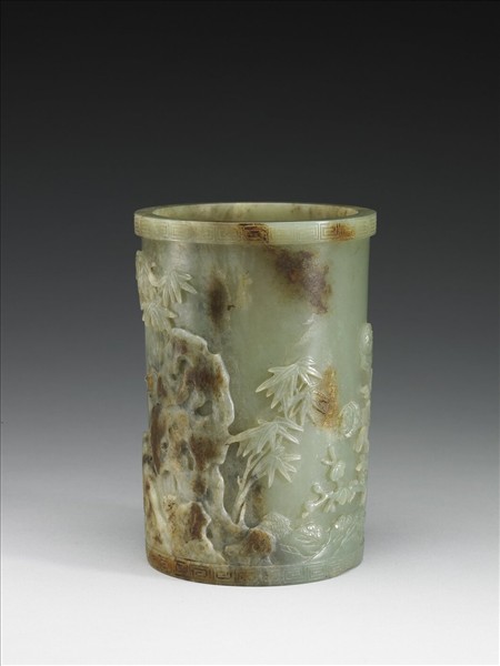 灰綠色玉,有赭斑。圓筒形狀,應為文人雅士書桌上的筆筒。口沿和底邊各一圈回紋,筒壁浮雕庭園一景。