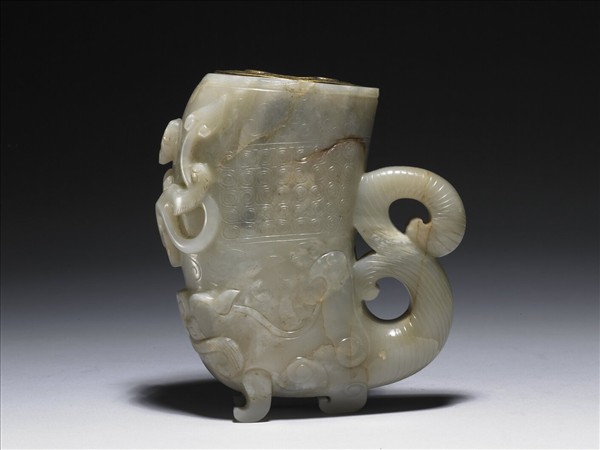 玉質,有明顯的裂紋。仿觥形制,下飾一異獸,獸尾上揚附於觥身一側。此器內部有一銅膽,在清宮中可能曾作花器使用。器壁上裝飾有兩隻螭龍以及圈狀花紋,雕工工整。