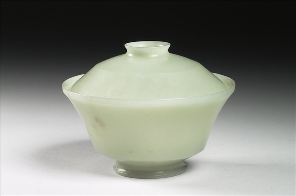 玉質,作成的一只蓋碗,光素無紋卻造型獨特,器蓋及腹有明顯折角,線條表現強烈。器略薄,展現玉器晶瑩剔透的質感。