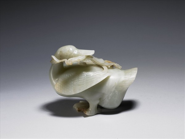 玉質。鳧,即俗稱的野鴨。玉鳧的頸、腹、足皆厚實,雙翅微張,鳧首回望,口啣稻穗。尾端的羽毛和足爪的皺褶,都是工匠仔細雕琢的部位。