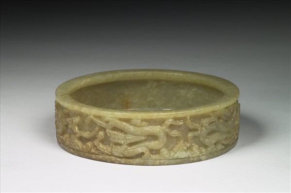 玉質,色黃,全器琢圓筒狀,器壁浮雕蟠龍。