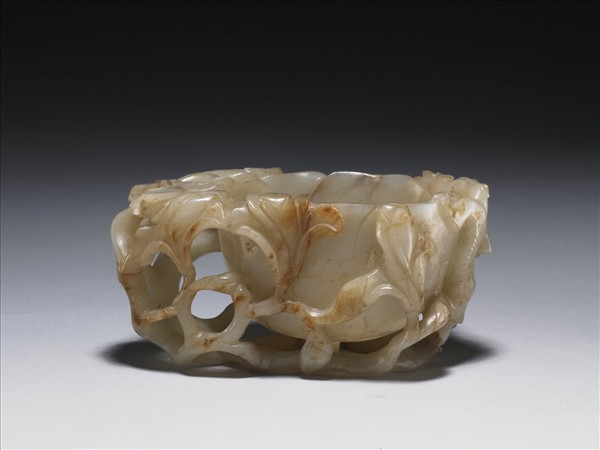 玉質,有條狀的赭色斑。全器作玉蘭花形,中心掏空作盛水之用。器內底陰刻花蕊,器壁又鏤雕有小玉蘭花和枝葉,延伸到杯底和側邊作為把手。
