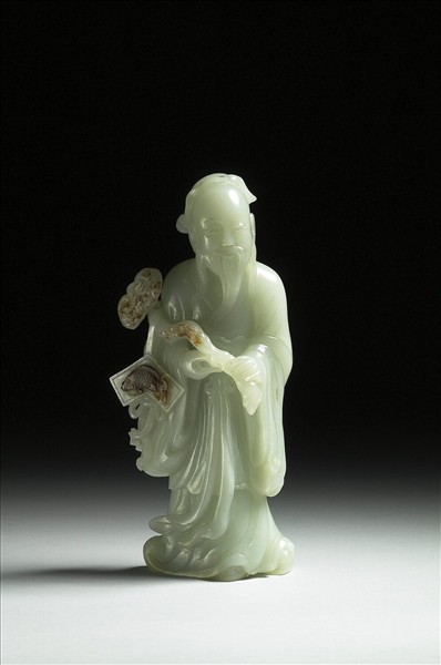 玉質,有赭斑。立雕表情和藹的仙人,手捧靈芝,靈芝上懸掛一塊結合磬和魚的飾物,諧音寓意「吉慶有餘」,靈芝一向被視為吉祥的植物,此器因而有祝福敬頌之意。