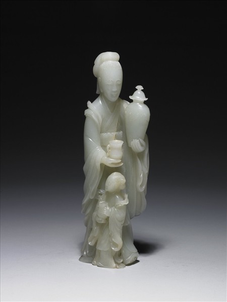 玉雕作仙女與仙童的形象,仙女左手捧帶蓋梅瓶、右手捧帶把罐,仙童亦雙手捧罐於胸前,側頭微笑。「瓶」與「平」同音,有平安之吉祥意義。
