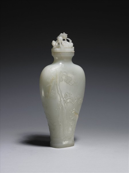肩部豐碩、腹部下斂的扁瓶,瓶蓋上雕盤龍,器腹浮雕「歲寒三友」的松竹梅,象徵君子之間的不變情誼。
